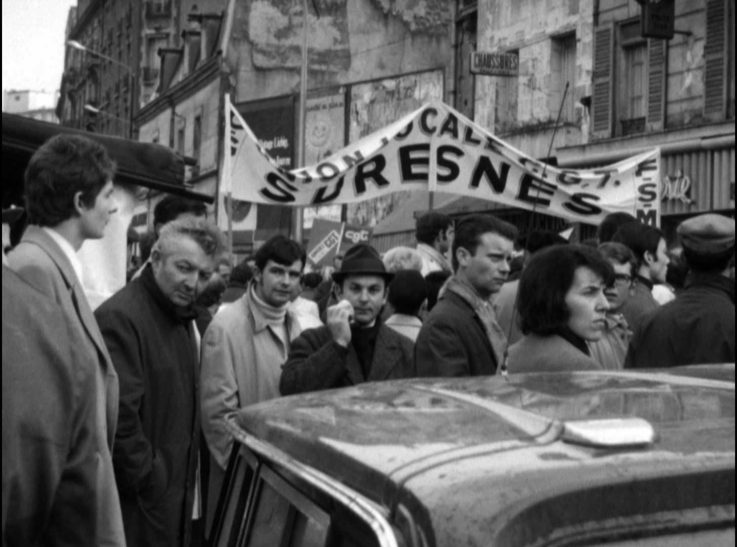 Dans la première partie du document, des représentants syndicaux s’expriment au micro devant une assistance réunie dans un local, probablement celui du comité d’établissement : Serge Fresneau, secrétaire CGT, Jean Lhopital, ingénieur et secrétaire CFDT, Serge Serikov, dessinateur et militant CGT. Un homme enregistre les différentes prises de parole à l’aide d’un magnétophone. La seconde partie rend compte de la manifestation qui suit dans les rues de Suresnes. Après une nouvelle série d’interventions, notamment celle de Serge Mathieu, responsable CGT, le cortège défile aux abords de l’usine et le long des quais de la Seine. Les banderoles et les pancartes portent des revendications et des slogans : « CGT Garantie de l’emploi et des ressources », « CGT AM Dassault Plein emploi : un programme pour l’industrie aérospatiale », « Imposer une discussion avec le patronat ». Un manifestant tient à la main la première page d’un numéro de l’hebdomadaire de la CGT, La Vie ouvrière, qui titre : « la défense du pouvoir d’achat ». La marche suit les quais de la Seine sous la pluie, remonte la rue Frédéric Clavel et marque un arrêt devant l’entrée de deux entreprises : la Saviem (Société anonyme de véhicules industriels et d’équipements mécaniques), filiale de la régie Renault, et la Sipa (Société nouvelle industrielle pour l’aéronautique).