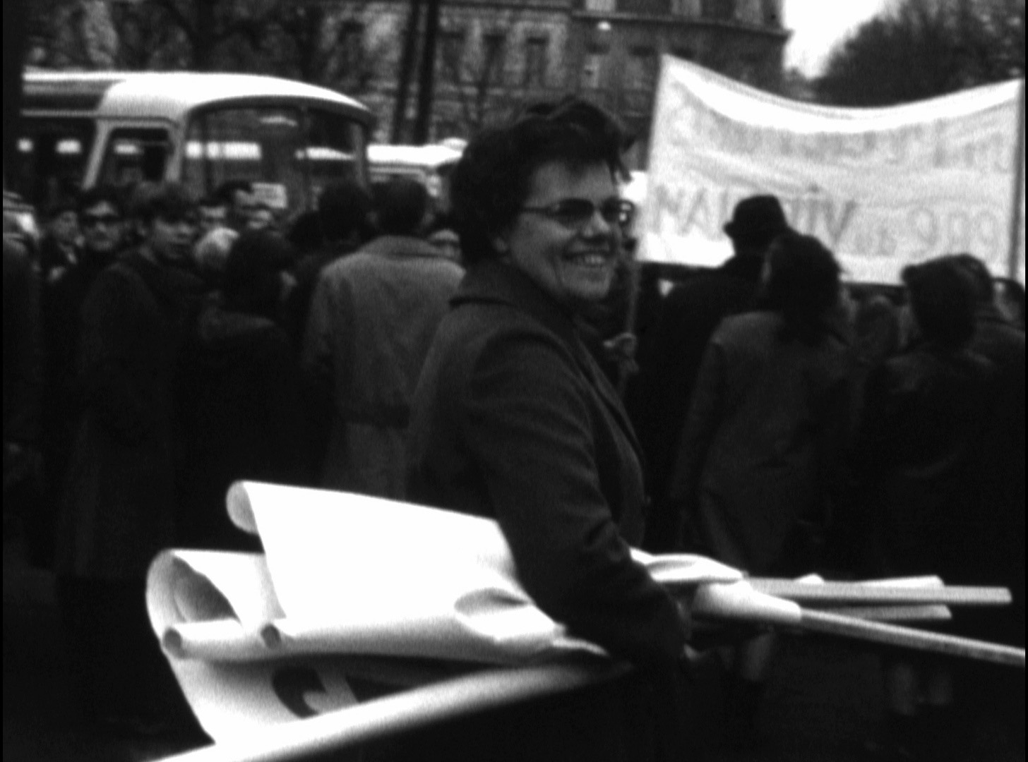 Plan Moyen d'un mur où sont collées des affiches, sur une, invitation à manifester pour le Viet-Nam le 09/03 (1968) à Lille. Plans de nouveaux arrivants descendant d'un autobus, certains ont des banderoles roulées, qui rejoignent la manifestation. Plan d'ensemble d'un espace transformé en grand parking où sont garés des dizaines d'autobus.